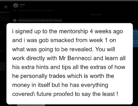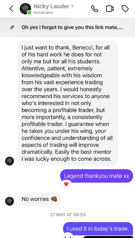 Tailored 60 minute weekly coaching calls with myself Benecci focusing on your current challenges and goals, in this we can work together teaching you how to read and use the tools and strategies, identify your weaknesses and create a personal education plan in order for you to totally master the markets and know when , how and why your entering and exiting the market.